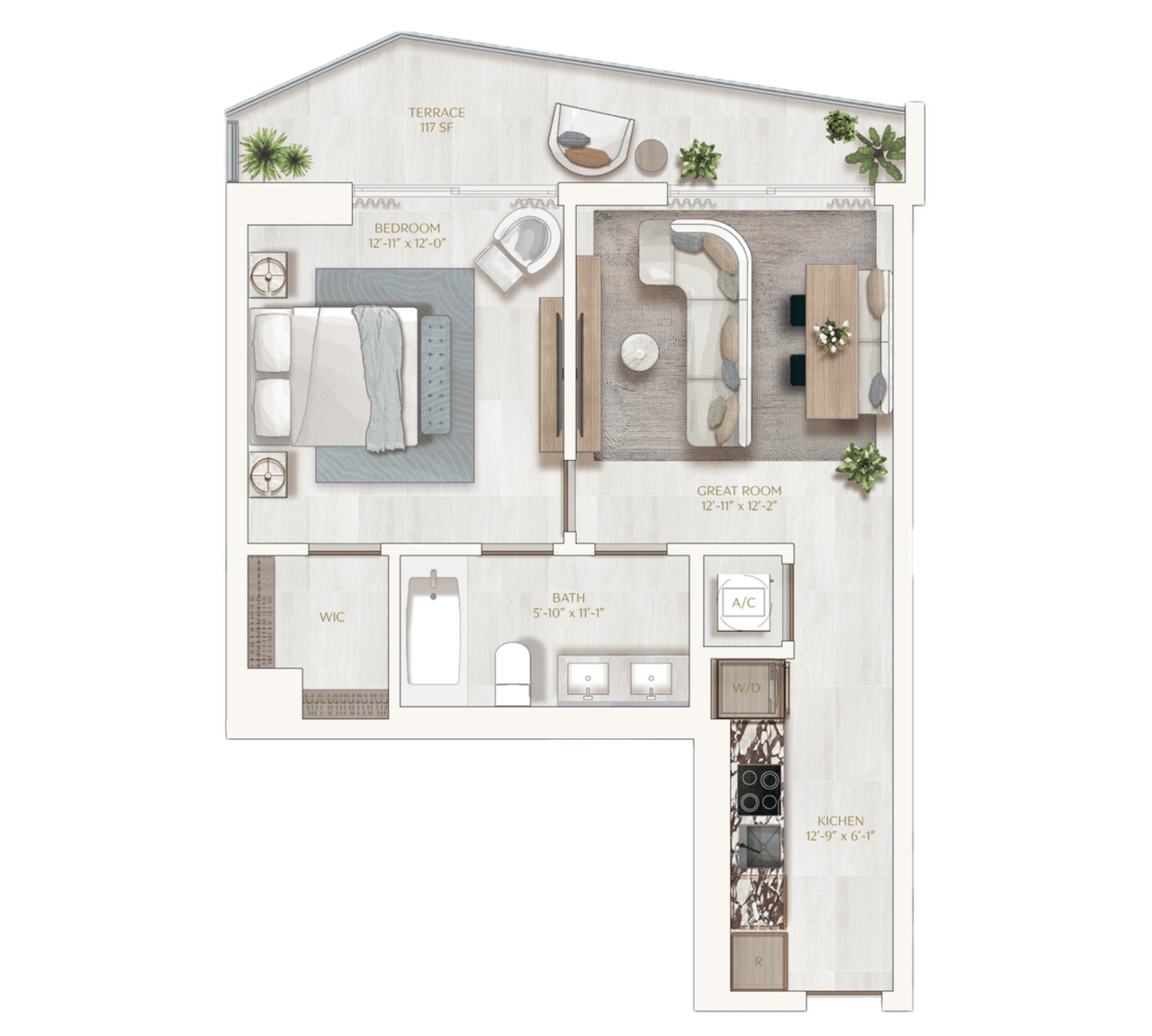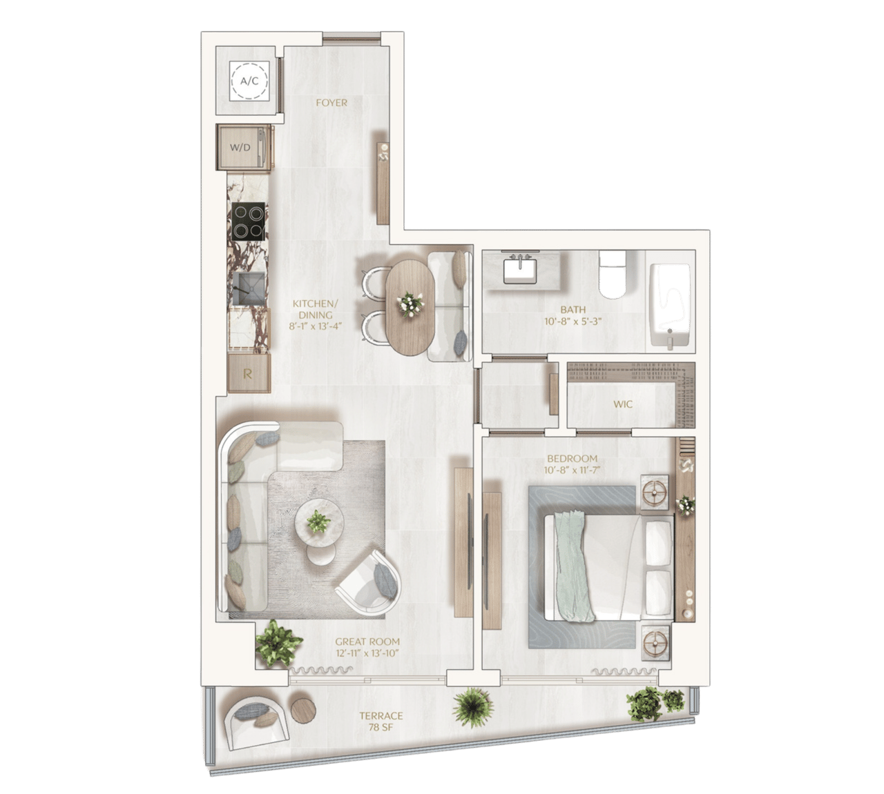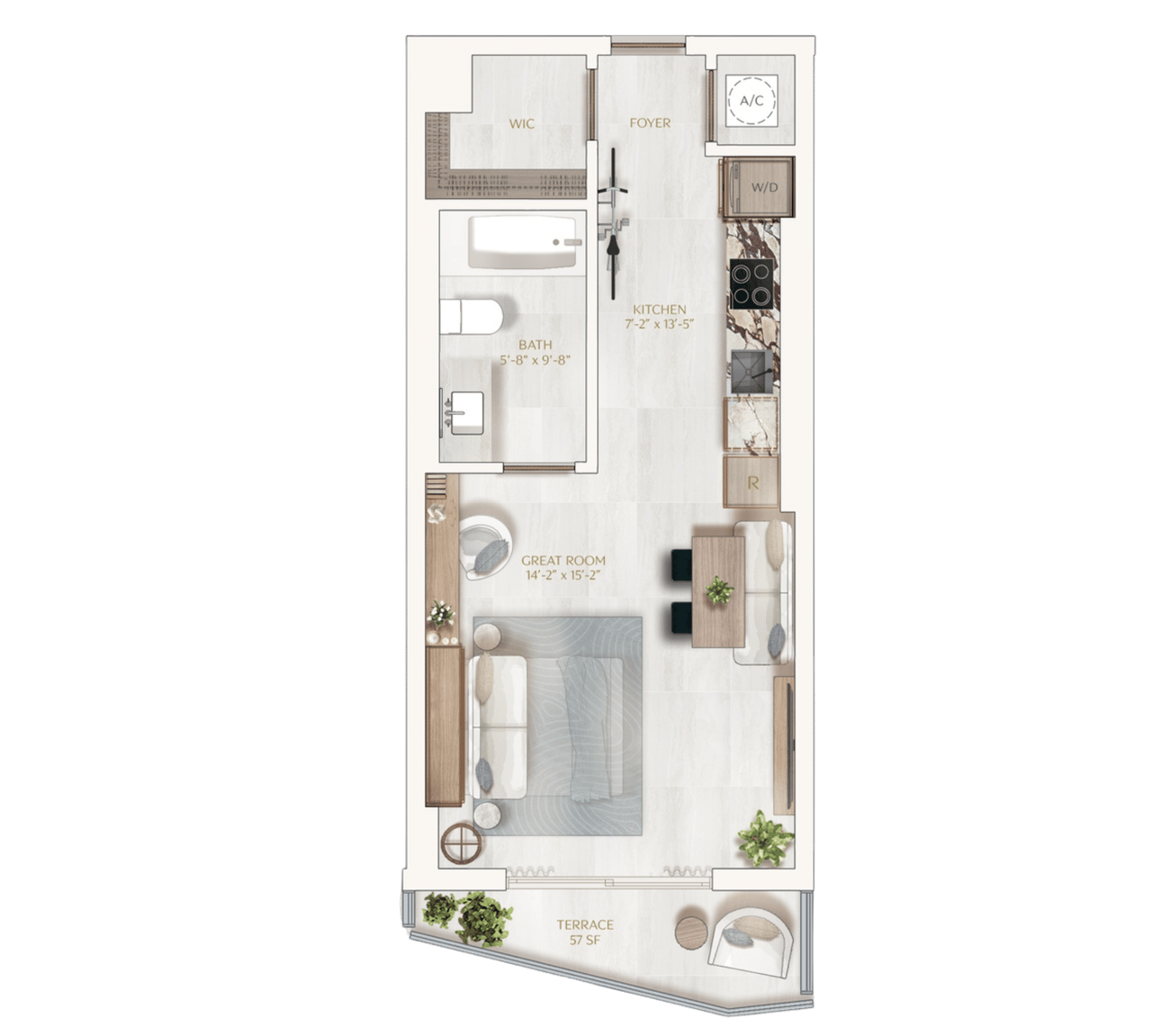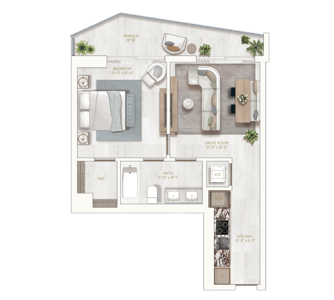 With 13-foot ceilings and wide, open layouts, the City Flats embody Viceroy’s signature sense of volume and design. Each residence feels airy and architectural—spaces that elevate daily living through light, scale, and effortless style.