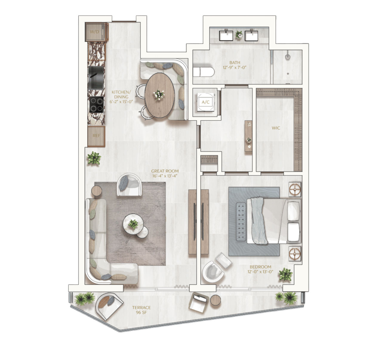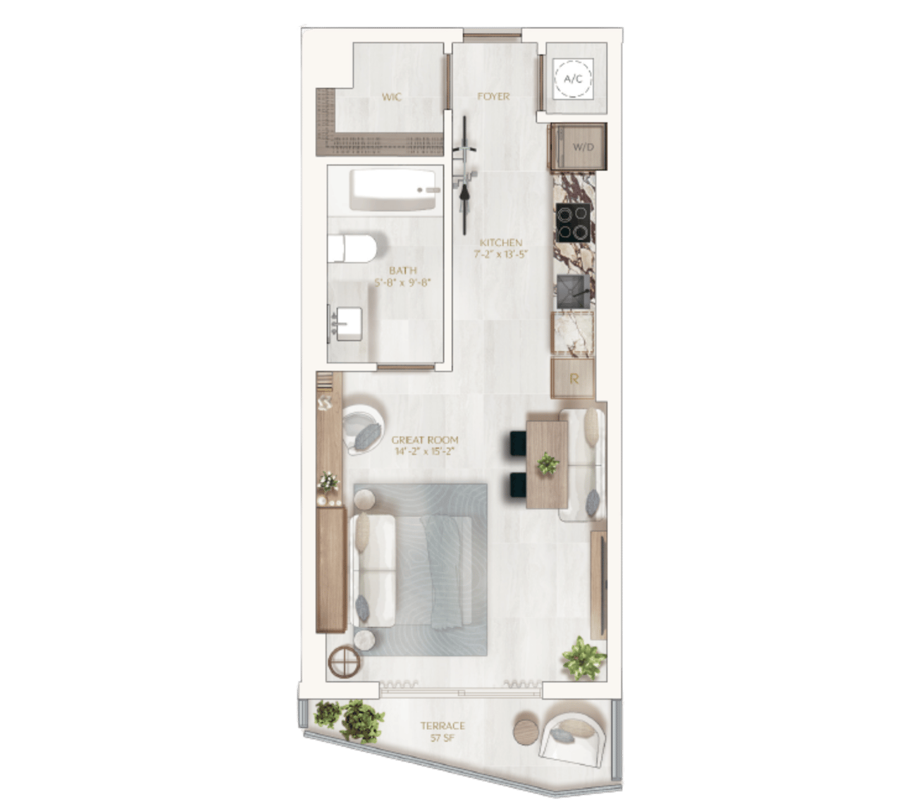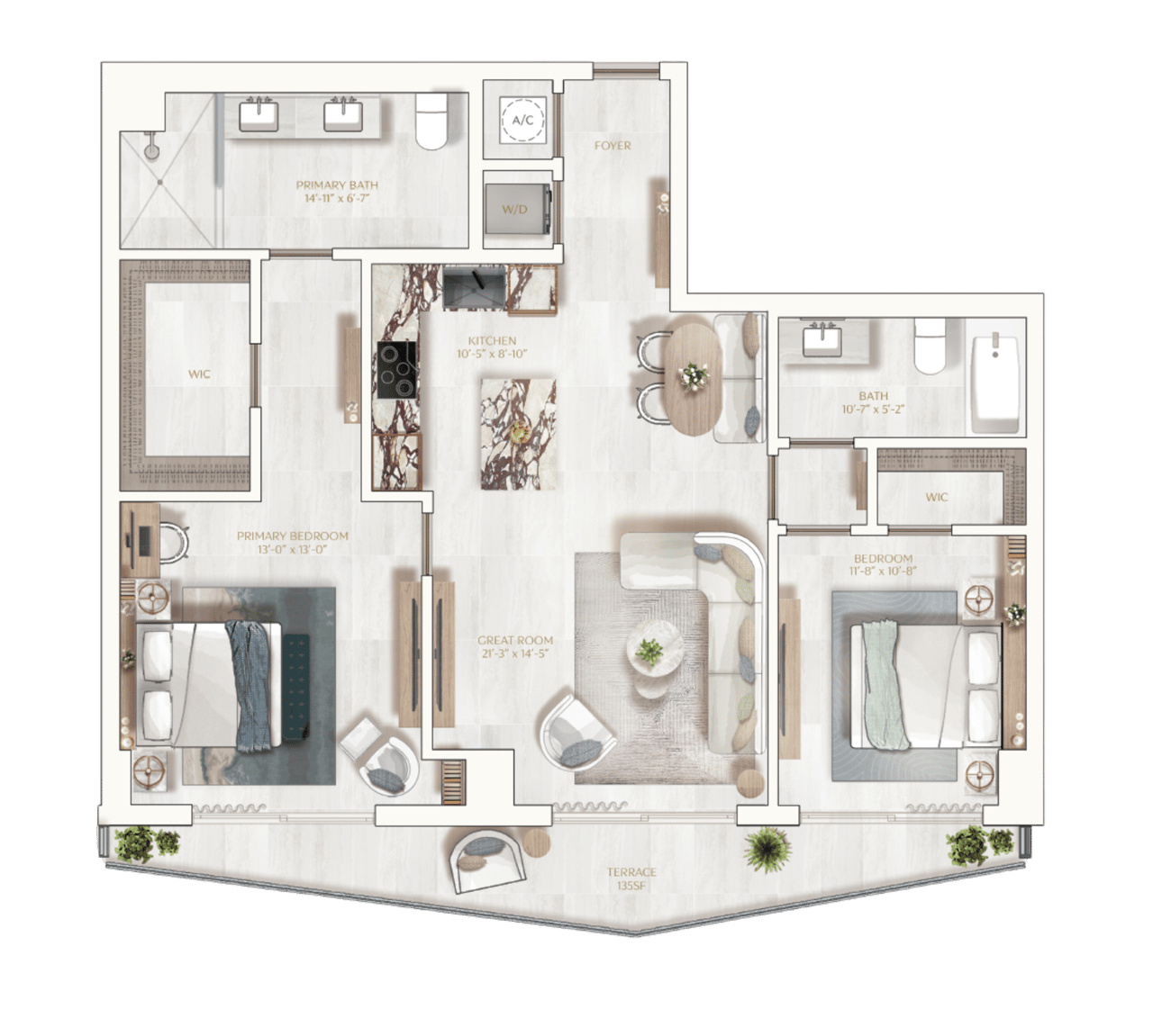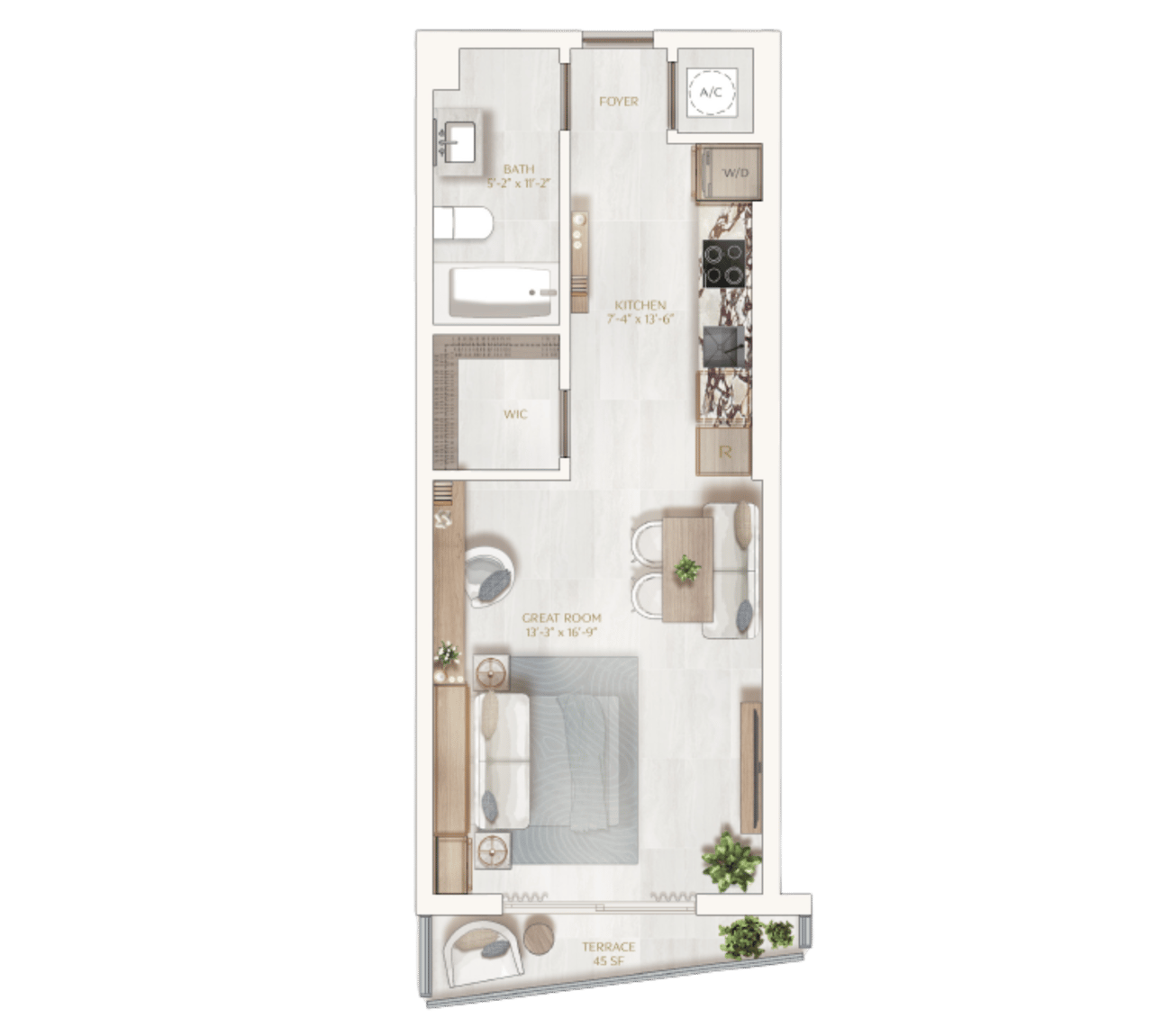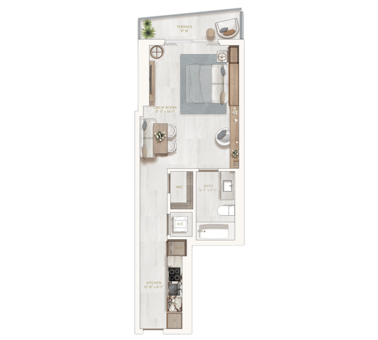 With 13-foot ceilings and wide, open layouts, the City Flats embody Viceroy’s signature sense of volume and design. Each residence feels airy and architectural—spaces that elevate daily living through light, scale, and effortless style.