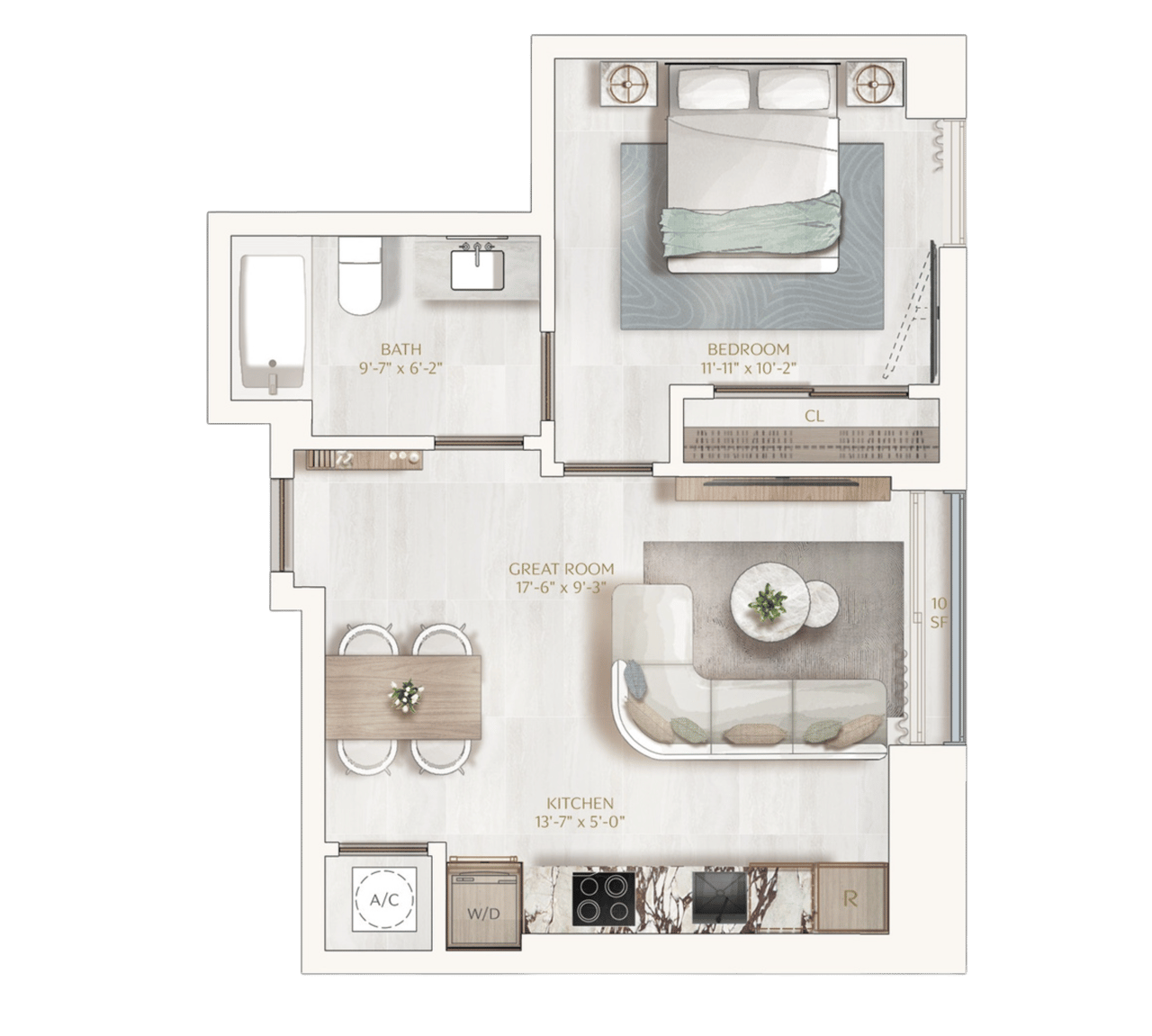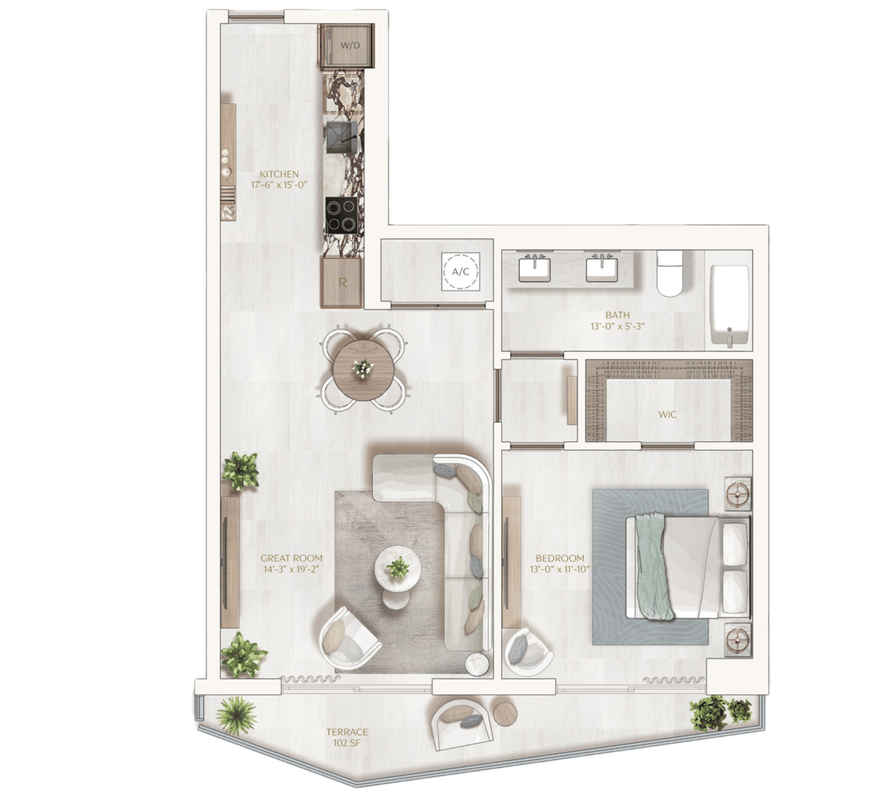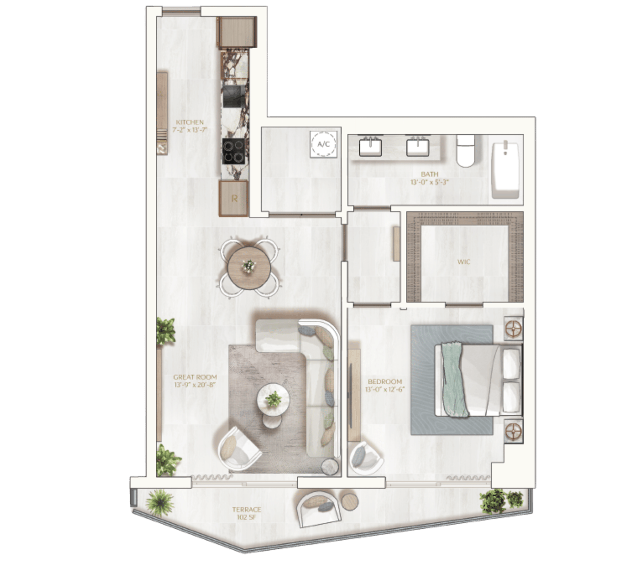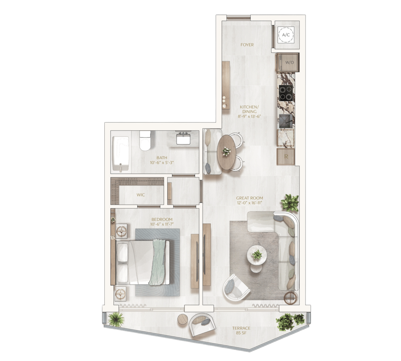With 13-foot ceilings and wide, open layouts, the City Flats embody Viceroy’s signature sense of volume and design. Each residence feels airy and architectural—spaces that elevate daily living through light, scale, and effortless style.