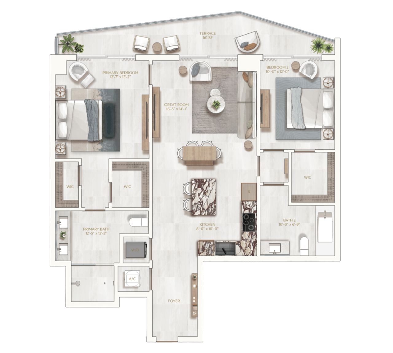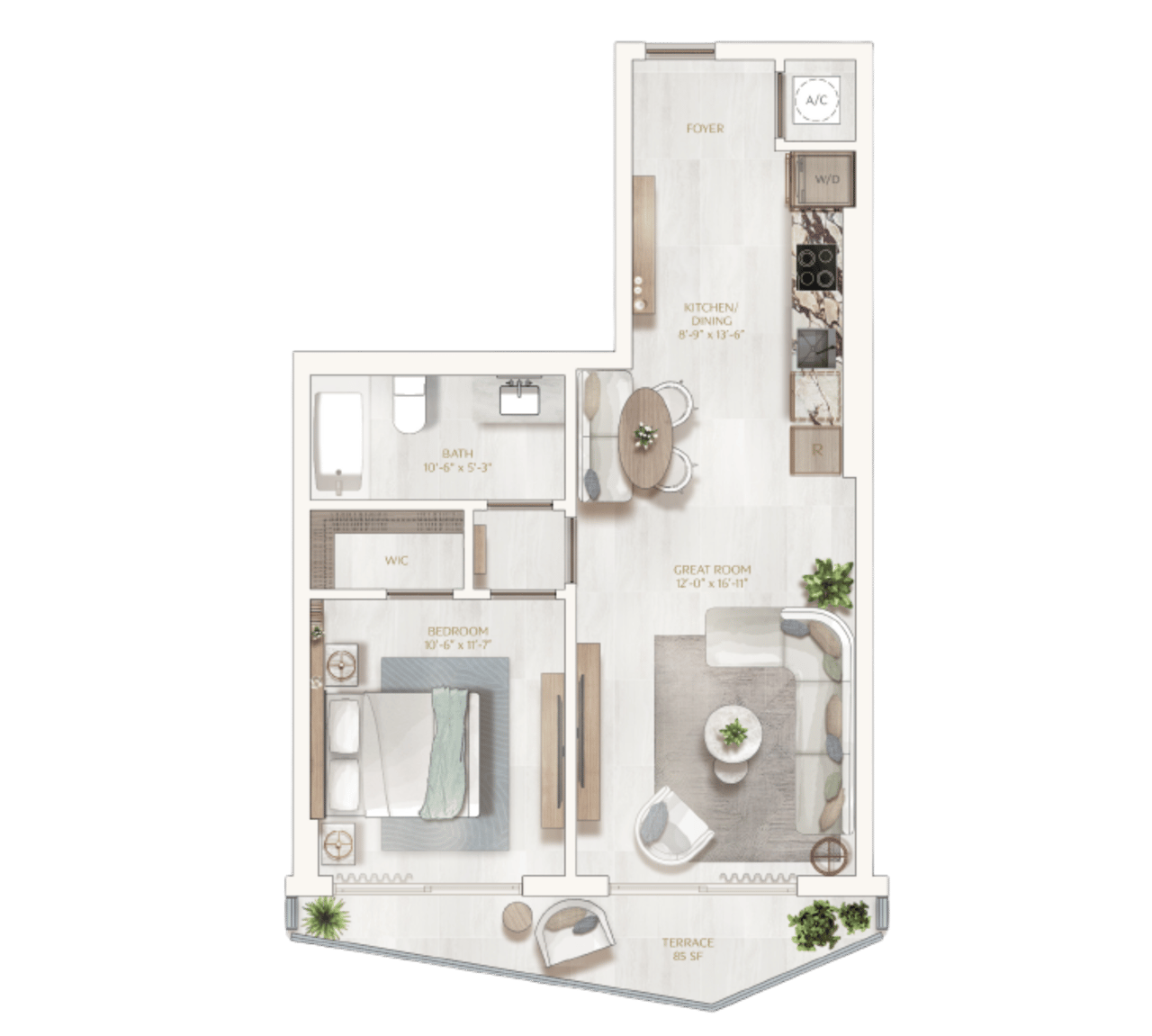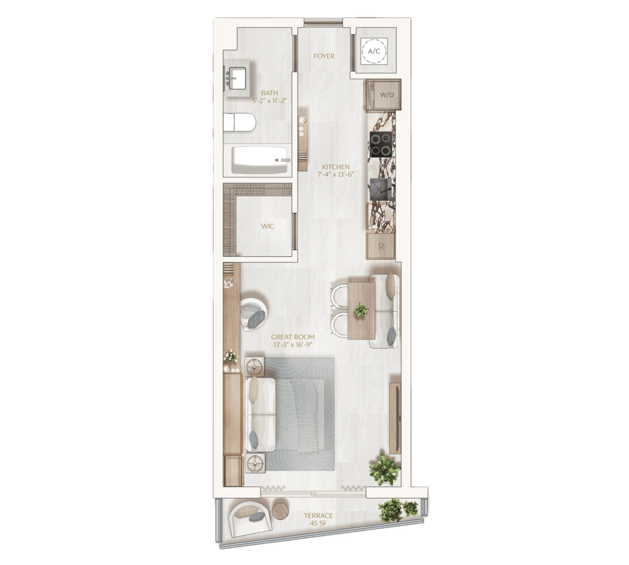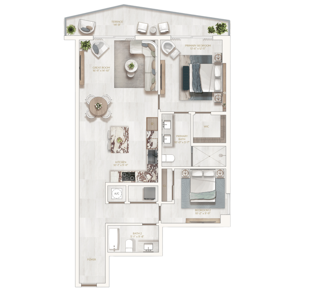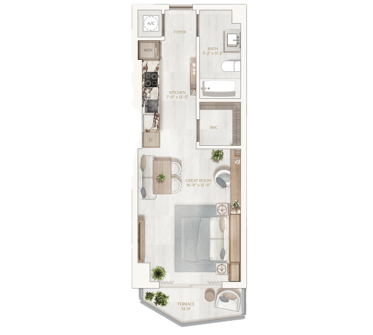 With 13-foot ceilings and wide, open layouts, the City Flats embody Viceroy’s signature sense of volume and design. Each residence feels airy and architectural—spaces that elevate daily living through light, scale, and effortless style.